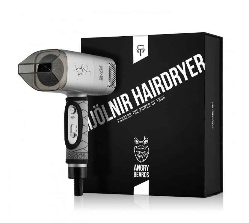 Fén české značky Angry Beards kovaný na míru chlapům. Design inspirovaný Thorem, výkon 2000 W, dva módy sušení a tlačítko pro styling a objem vlažným vzduchem. Rukojeť se softshellovým rukávem pro pohodlnější držení. Přívodní kabel má délku 1,7 m. Hmotnost 340 g.