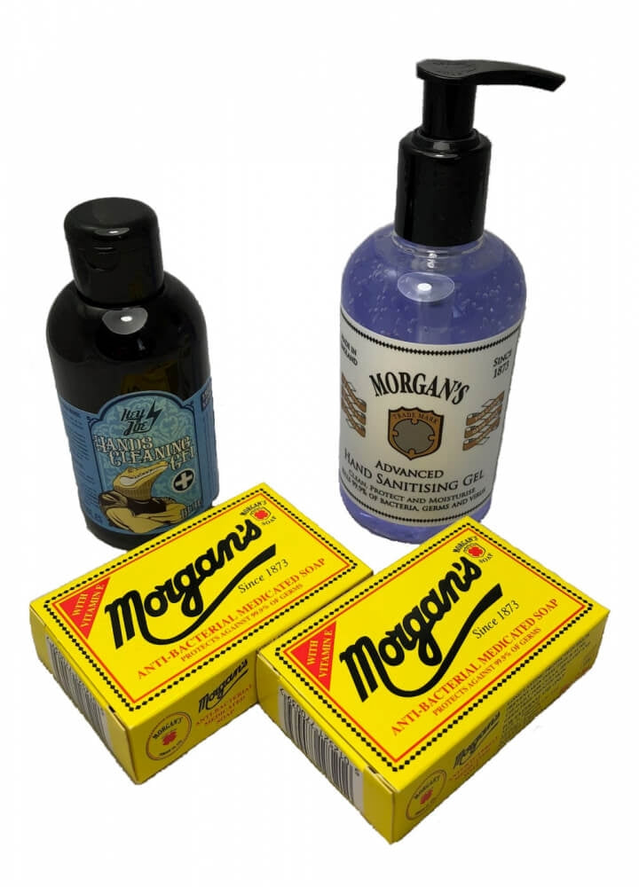 Dezinfekční balíček obsahuje 2 antibakteriální mýdla Morgans (80g) na tělo a tvář, dezinfekční gel na ruce Morgans (250 ml) bez parfemace a cestovní balení antibakteriálního gelu Hey Joe (150 ml) s vůní melounu.