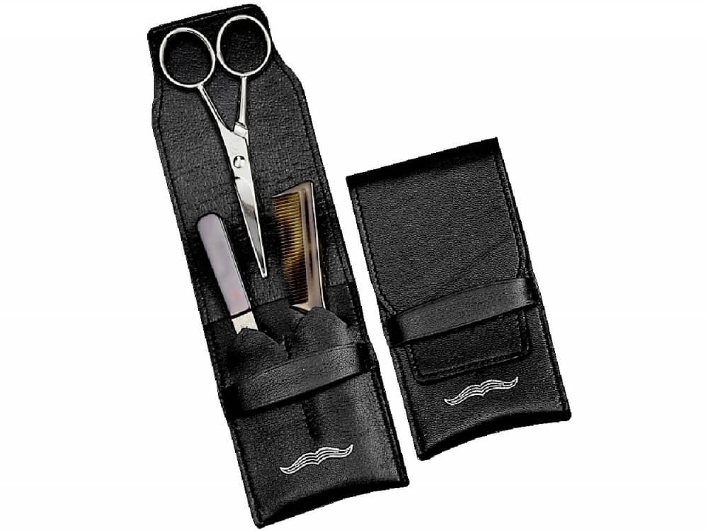 Sada pro péči o vousy a knír v ručně vyrobeném koženém pouzdře z měkké nappa hovězí kůže. Sada obsahuje nůžky na vousy (10 cm) z nerezové ocele, hřebínek na vousy z pracé rohoviny a pilník (11 cm) s jemnou a hrubou stranou. Vyrobeno v Německu.