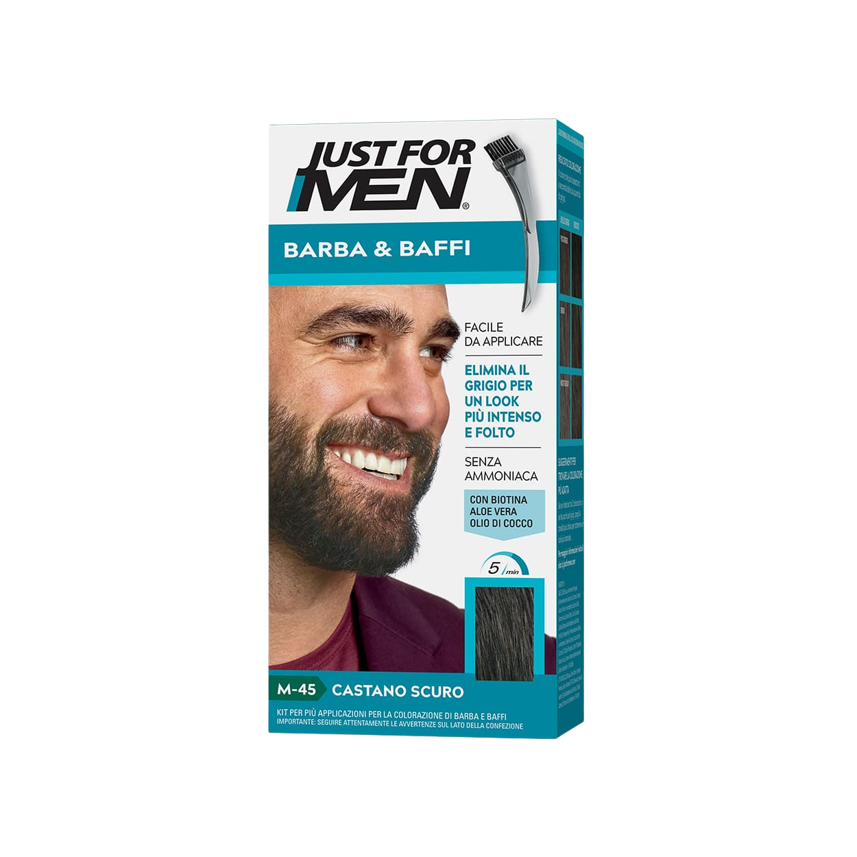 Zbavte se šedin za 5 minut. Just For Men M-45 (Tmavě hnědá) je světová jednička v barvení vousů. Gel s biotinem a aloe vera pro 100% přirozený vzhled, hustotu a péči. Snadná aplikace, permanentní výsledek.