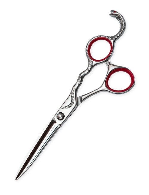 Kadeřnické nůžky Kanpeki Cobra v délce 6 palců jsou vyrobeny z velmi kvalitní japonské nerezové ocele. Mají jedinečný a nápaditý design s motivem kobry. Doplňky jsou v červené barvě. Dlouhá a úzká čepel zaručuje rovný střih a je vhodná pro stříhání přes hřeben.
