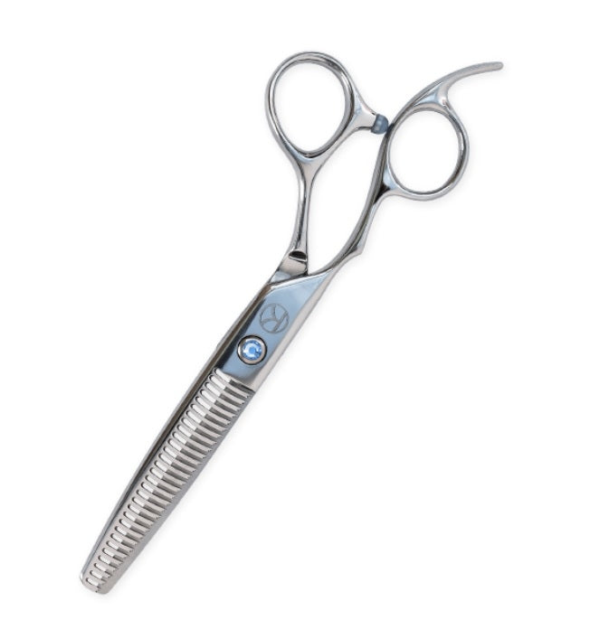 Profesionální jednostranné efilační nůžky Kanpeki Sapphire v délce 6ti palců vyrobené z kvalitní nerezové ocele jsou perfektní pro texturování vlasů všech délek. Jsou ozdobeny modrým kamínkem. Ideální pro práci s hřebenem. Inovativní profil zubů zajišťuje snadnou efilaci a vlasy nezůstávají v nůžkách. Určeno pro leváky.