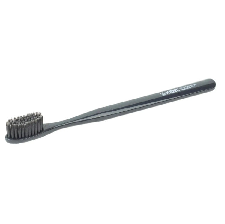 Zubní kartáček Kent speciálně navržený pro velmi citlivé dásně. Z extra jemnými nylonovými štětinami, které obsahují aktivní uhlí pro účinnější odstranění zubního plaku, a stříbro s antibakteriálními vlastnostmi brání množení bakterií na kartáčku. Barva kartáčku je bílo-šedá. Dodáváno v plastovém pouzdře. Vyrobeno v Anglii.