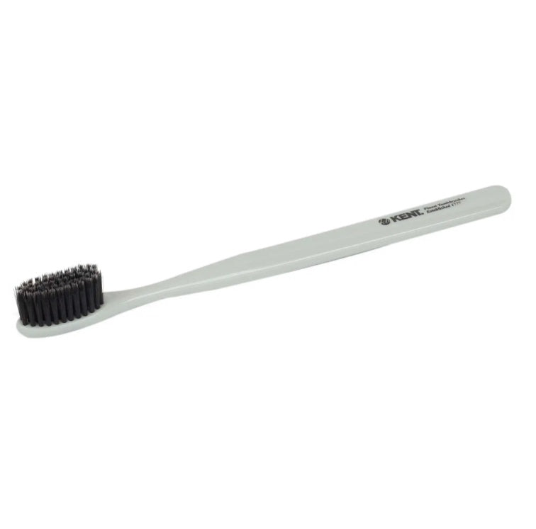 Zubní kartáček Kent speciálně navržený pro velmi citlivé dásně. Z extra jemnými nylonovými štětinami, které obsahují aktivní uhlí pro účinnější odstranění zubního plaku, a stříbro s antibakteriálními vlastnostmi brání množení bakterií na kartáčku. Barva kartáčku je bílo-šedá. Dodáváno v plastovém pouzdře. Vyrobeno v Anglii.