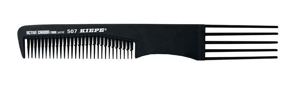 Profesionální tupírovací hřeben Kiepe 507 dlouhý 195 mm s aktivními karbonovými vlákny. Má antistatickou a antibakteriální úpravu. Je odolný vysokým teplotám (až 230 °C) a chemikáliím. Zaoblené hrany zubů jsou příjemné pro vlasy i vlasovou pokožku. Hřeben je odhlehčený a odolný.