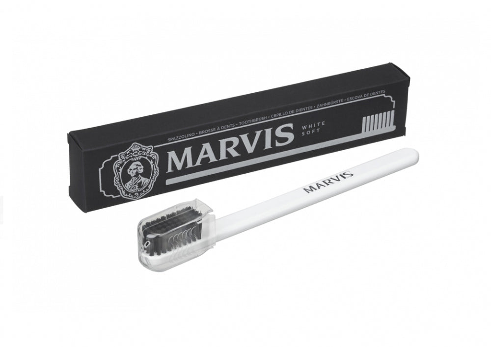 Bílý zubní kartáček Marvis je nezbytným prvkem dokonalé ústní hygieny. Kartáček je plastový, bílé barvy, osazený měkkými nylonovými vlákny v černé barvě. Vlákna jsou rovně zastřižena, měkké (soft). Součástí kartáčku je cestovní krytka hlavy kartáčku.