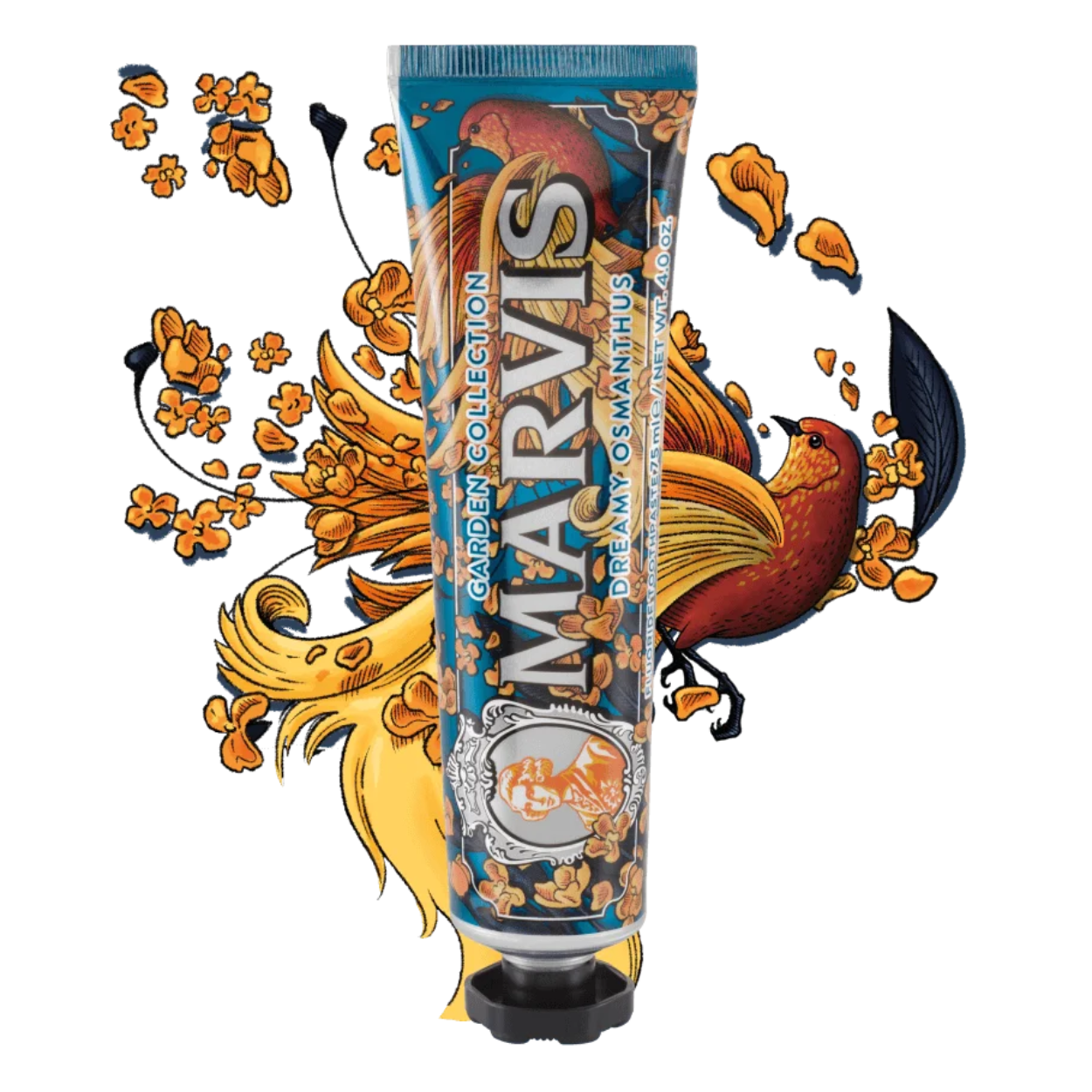 Marvis Dreamy Osmanthus zubní pasta 75 ml z limitované edice spojuje květinovou vůni vonokvětky se svěží mátou, účinně odstraňuje plak, chrání sklovinu díky fluoridu a xylitolu a zanechává dlouhotrvající pocit čistoty v ikonickém prémiovém provedení.
