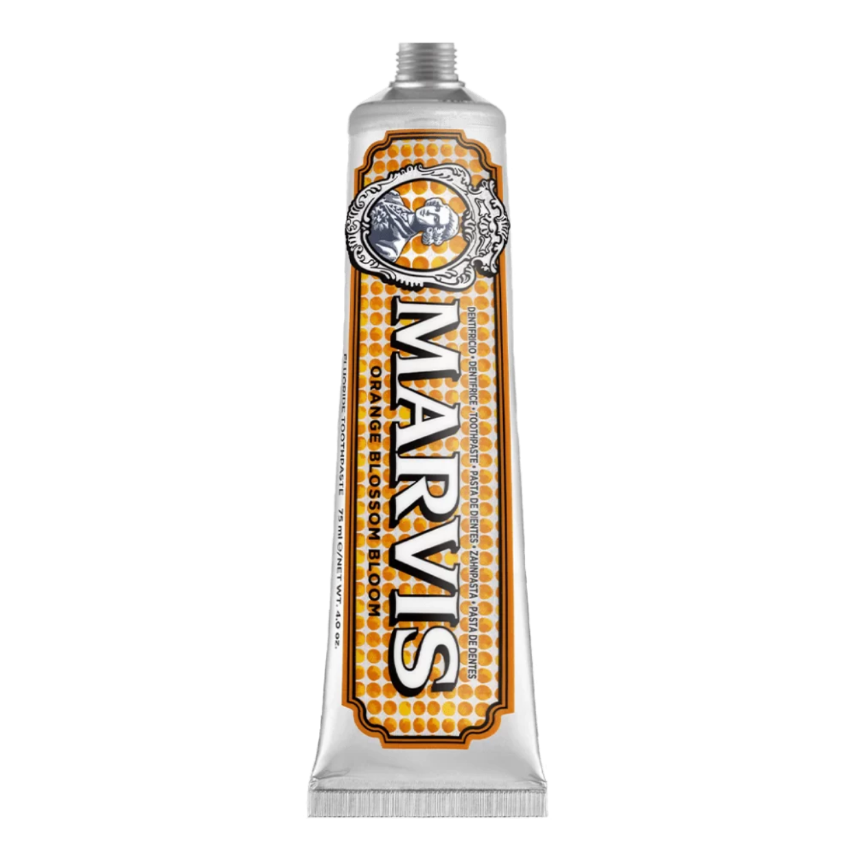 Marvis Orange Blossom Bloom zubní pasta 75 ml spojuje vůni pomerančového květu a máty, šetrně odstraňuje plak, chrání sklovinu díky fluoridu a xylitolu a zanechává dlouhotrvající svěží citrusově-mátový dech v ikonické tubě značky Marvis.