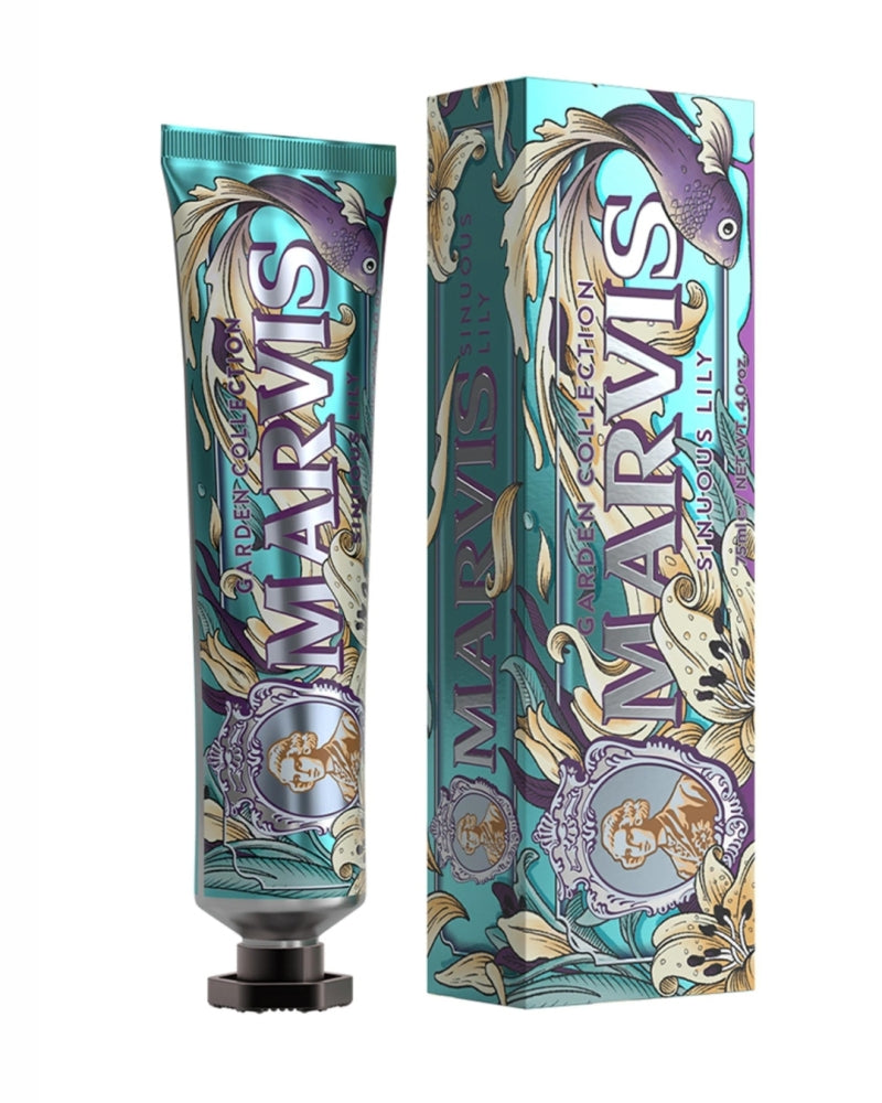 Prémiová italská zubní pasta Marvis z limitované kolekce květinových příchutí. Marvis Sinuous Lily má jemnou chuť čisté lilie kombinovanou se silnou svěžestí máty. Výborně odstraňuje zubní plak a zubní kámen. Tato krémová pasta je vyrobena podle tradiční metody, má složení s nízkou pěnivostí a nevysychá. Obsahuje 0,25% fluoridu sodného a xylitol. Neobsahuje látky živočišného původu. Objem 75 ml.