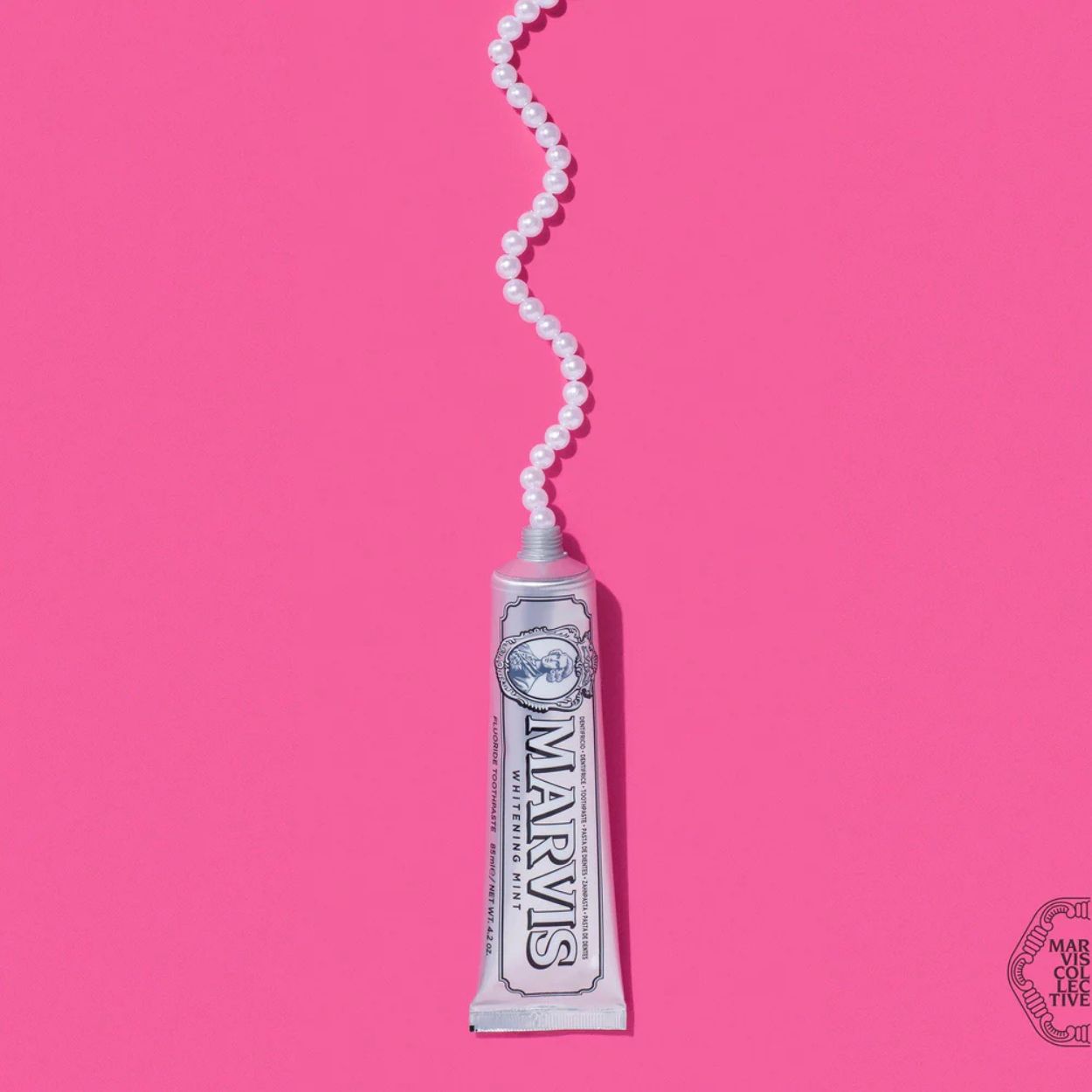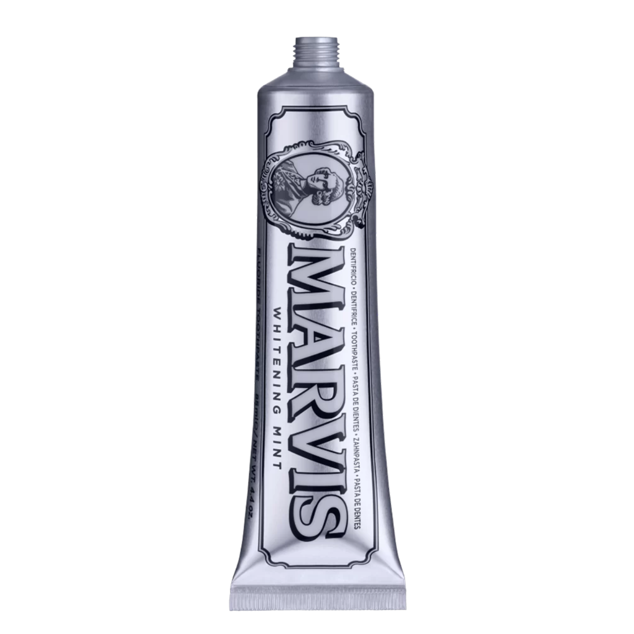 Marvis Whitening Mint zubní pasta 85 ml šetrně odstraňuje povrchové skvrny, posiluje sklovinu díky fluoridu a zajišťuje intenzivně svěží mátový dech po celý den. Ideální pro každodenní bělení zubů bez nadměrného obrušování.