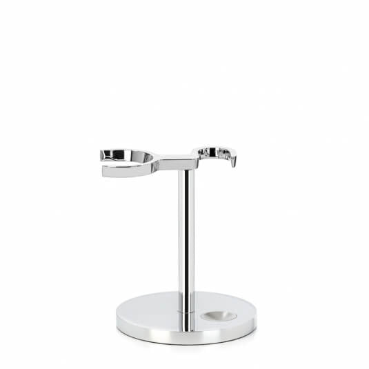 Univerzální chromovaný stojánek na strojek a štětku umožňuje sestavit si vlastní sadu stojánku, štětky a strojku či břitvy na holení. Vyrobeno v Německu.