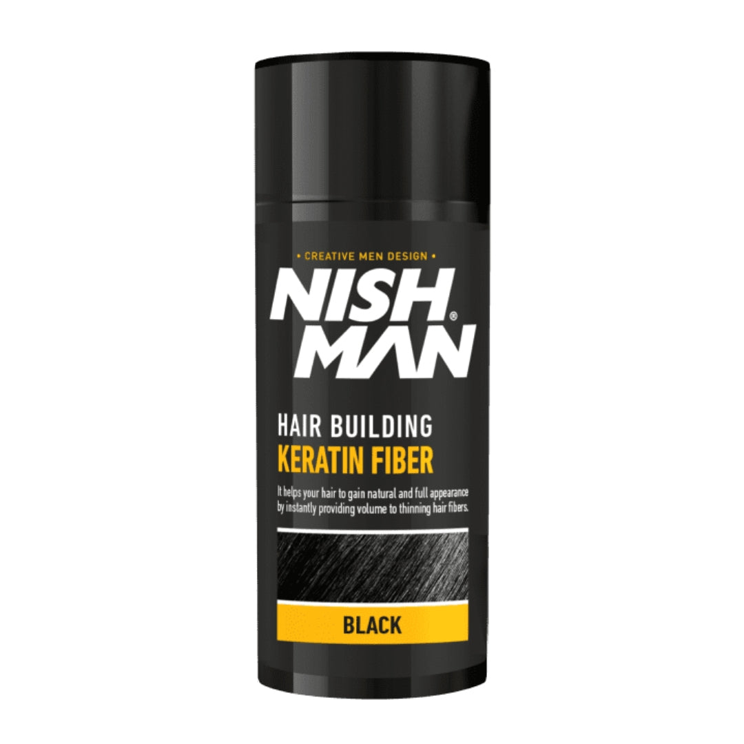 Nishman keratinová vlasová vlákna v černé barvě jsou určena pro zahuštění řídkých a řídnoucích vlasů. Vlákna jsou vyrobena z barveného keratinového proteinu, který je složením shodný s přirozeným keratinem lidských vlasů. Elektrostaticky se vážou na vaše vlastní vlasy, čímž vytvářejí přirozený a objemný vzhled. Lze je využít také na zakrytí šedin. Po zafixování vydrží vlákna na vlasech po celý den. Objem 21g.