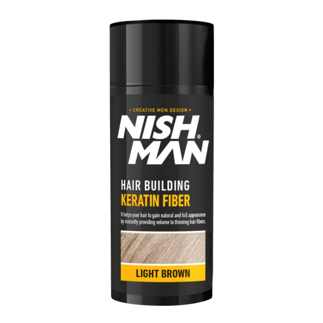 Nishman keratinová vlasová vlákna ve světle hnědé barvě jsou určena pro zahuštění řídkých a řídnoucích vlasů. Vlákna jsou vyrobena z barveného keratinového proteinu, který je složením shodný s přirozeným keratinem lidských vlasů. Elektrostaticky se vážou na vaše vlastní vlasy, čímž vytvářejí přirozený a objemný vzhled. Lze je využít také na zakrytí šedin. Po zafixování vydrží vlákna na vlasech po celý den. Objem 21g.