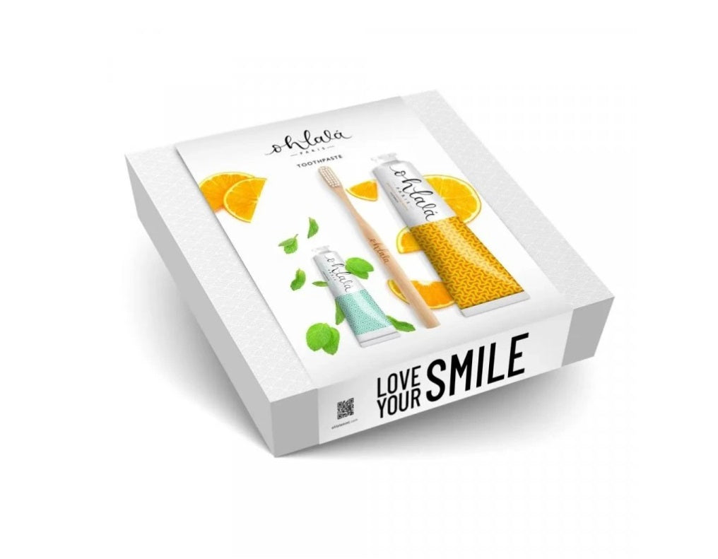 Cestovní sada obsahuje bambusový kartáček na zuby, pomerančovou zubní pastu (75 ml) a mátovou zubní pastu (15 ml). Pěnivá zubní pasta Ohlalá pomáhá chránit před zubním kazem a posilovat sklovinu. Odstraňuje zubní plak a zubní kámen. Zanechává v ústech dlouhodobý pocit svěžesti. Obsahuje fluorid (1450 ppm) a 96% přírodních složek. Bez parabenů.