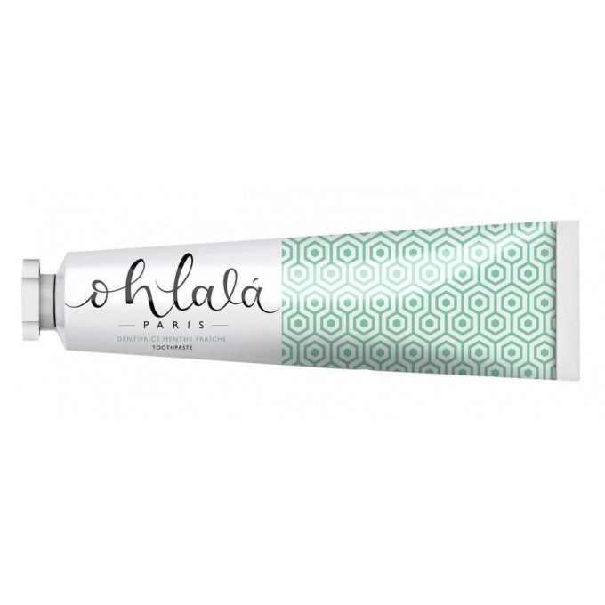 Ohlalá Fresh Mint zubní pasta 75 ml s intenzivní mátovou příchutí, 96 % přírodních složek, fluoridem 1450 ppm a xylitolem účinně odstraňuje plak, posiluje sklovinu a zajišťuje dlouhotrvající svěží dech bez parabenů.