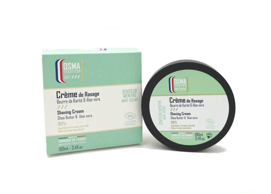 Kvalitní krém na holení od Osma je z 98 % složený z přírodních ingrediencí s BIO certifikací, proto zajišťuje jemné a šetrné oholení i pro tu nejcitlivější pokožku. Je obohacený o bambucké máslo, které hydratuje pokožku a ulehčuje klouzání holicího strojku při holení. Přidaná aloe vera zklidňuje a hydratuje pokožku, pomáhá redukovat podráždění a zajišťuje maximální komfort po holení. Díky své krémové a hutné konzistenci se holicí krém snadno nanáší a vytváří dokonale hladký povrch pro přesné a pohodlné oholení. Osvěžující a povzbuzující mátová vůně, ideální pro horké dny nebo po sportu. Objem 100 ml.