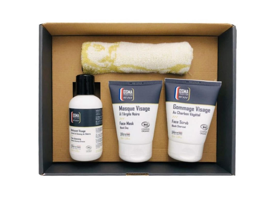 Dárková sada Osma pro péči o pleť obsahuje čisticí gel na obličej (125 ml), pleťový peeling (100 ml), pleťovou masku (100 ml) a ručník. Čisticí gel na obličej pro zdravou a čistou pleť. Důkladně čistí pokožku, díky výtažku ze sibiřského ženšenu tonizuje a revitalizuje. Chrání pleť před nepříznivými vnějšími vlivy. Pleťový peeling s perličkami z aktivního uhlí hloubkově čistí a odstraňuje odumřelé buňky. Pleťová maska s aktivním uhlím čistí pleť do hloubky a dodává pokožce zdravější a mladší vzhled. Olej z hroznových jader a bambucké máslo pleť vyživují a hydratují. Malý ručník od značky Osma vyrobený ze 100% bavlny je ideální pro osušení tváře po umytí nebo holení. Dodáváno v dárkové krabičce.