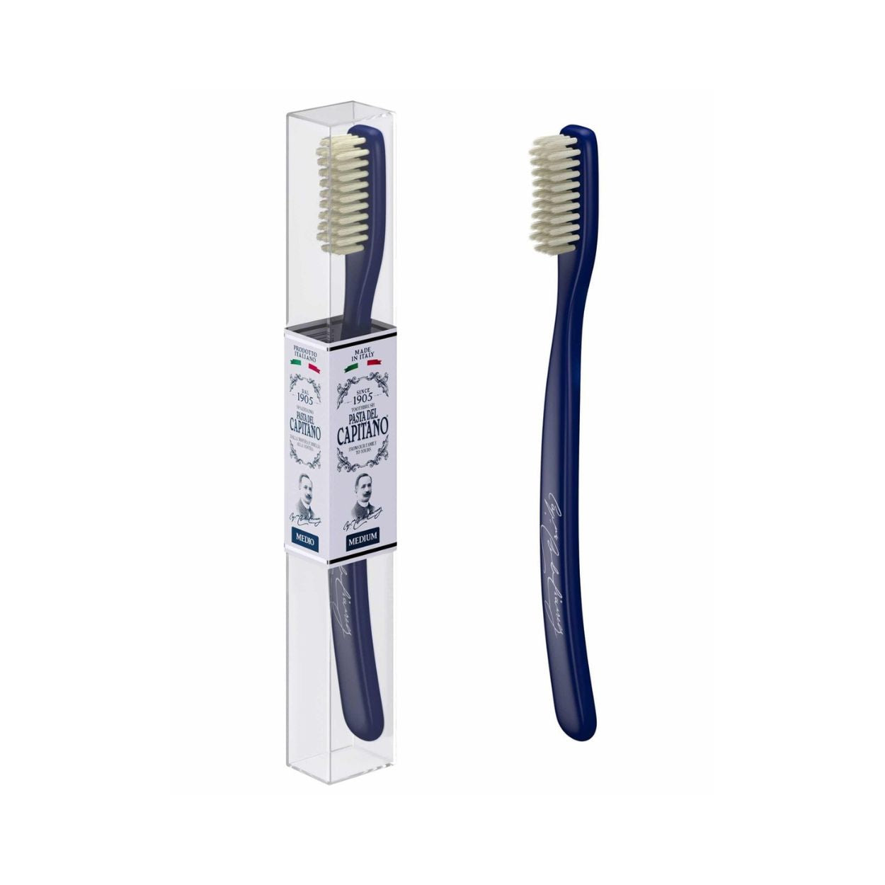 Pasta del Capitano Medium Blue zubní kartáček se středně tvrdými nylonovými vlákny, kompaktní hlavicí a ergonomickou rukojetí zajišťuje účinné odstranění plaku a pohodlné každodenní čištění zubů v nadčasovém modrém provedení.
