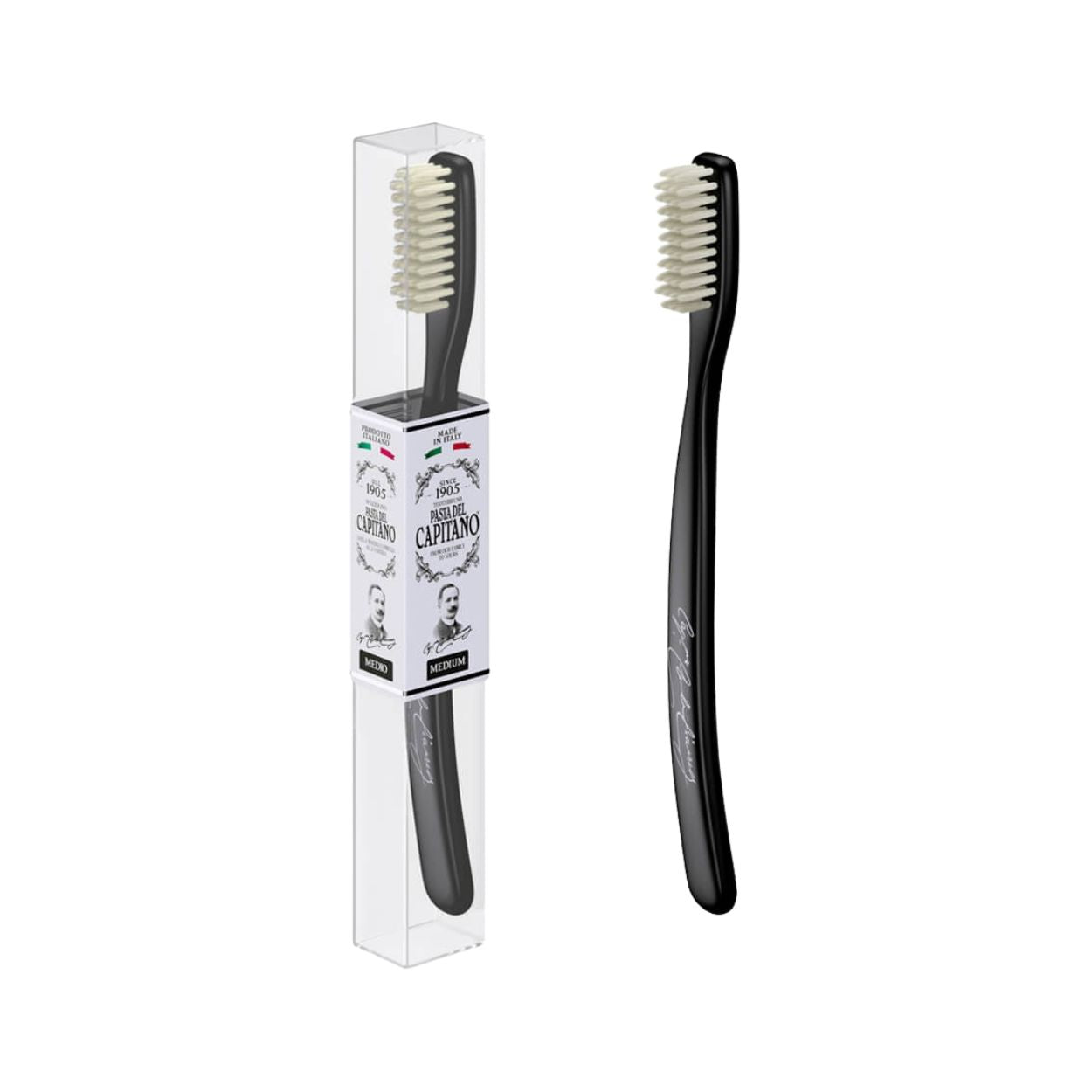 Pasta del Capitano Medium zubní kartáček s černým designem, středně tvrdými nylonovými vlákny, větší hlavicí, ergonomickou rukojetí a ochrannou krytkou pro účinné a pohodlné každodenní čištění zubů.