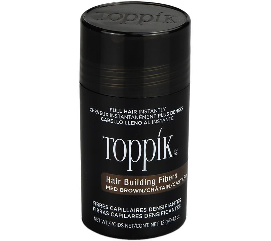 Toppik keratinová vlasová vlákna v barvě středně hnědá. Jsou určena pro zahuštění řídkých a řídnoucích vlasů. Vlákna jsou vyrobena z barveného keratinového proteinu, který je totožný s keratinem lidských vlasů. Jsou nabitá statickou elektřinou a tak se jednoduše navážou k vašim vlasům. Vytváří strukturu, která vypadá jako přirozený vlasový porost nejen vzhledem, ale i hustotou. Toppik lze využít také na zakrytí šedin. Po zafixování vydrží vlákna na vlasech po celý den. Hmotnost 12g.
