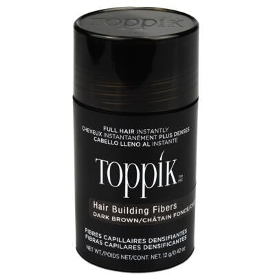 Toppik keratinová vlasová vlákna v barvě tmavě hnědá. Jsou určena pro zahuštění řídkých a řídnoucích vlasů. Vlákna jsou vyrobena z barveného keratinového proteinu, který je totožný s keratinem lidských vlasů. Jsou nabitá statickou elektřinou a tak se jednoduše navážou k vašim vlasům. Vytváří strukturu, která vypadá jako přirozený vlasový porost nejen vzhledem, ale i hustotou. Toppik lze využít také na zakrytí šedin. Po zafixování vydrží vlákna na vlasech po celý den. Hmotnost 12 g.