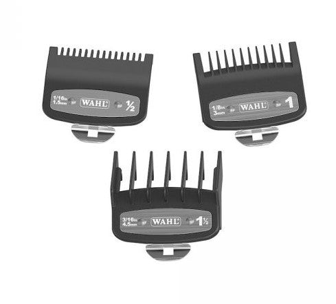 Sada 3 ks plastových přídavných hřebenů na střihací strojky WAHL. Velikosti hřebenů: 1.5, 3 a 4.5 mm.