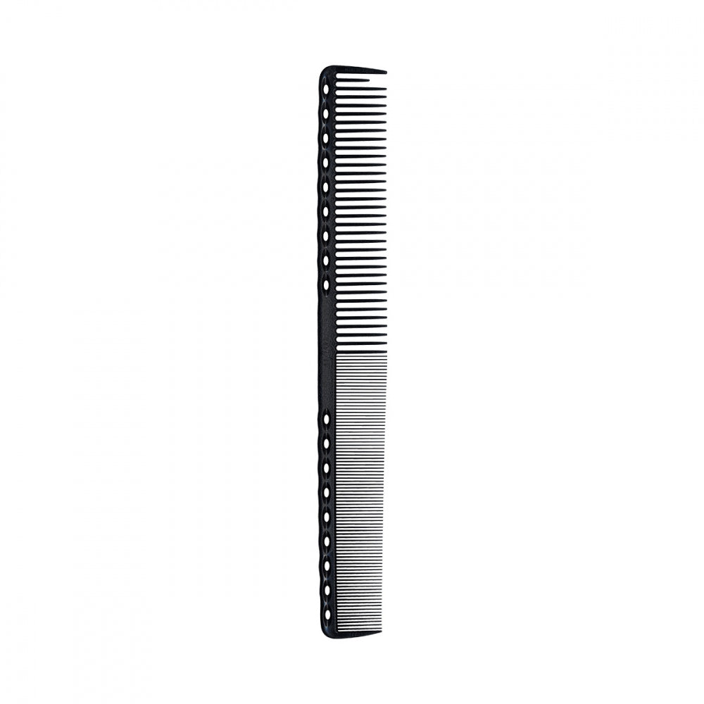 Střihací hřeben Y. S. Park s délkou 230 mm v černé barvě určený pro delší až velmi dlouhé vlasy. Je šiřší pro lepší úchop během česání a má delší zoubky. Ieální pro vytvoření objemu a zvýraznění textury. Díky speciálnímu tvaru, kdy zuby mají největší délku uprostřed hřebene, lze hřeben lépe uchopit a pramen vlasů dobře drží. Zuby mají kulaté zakončení pro šetrnost k vlasové pokožce. Otvory zvyšují pružnost hřebene a také snižují jeho váhu pro pevnější úchop. Je vyroben z vysoce kvalitního materiálu super plastic, který je lehký, vysoce odolný proti poškození vysokými teplotami nebo chemickými látkami a má dlouhou životnost. Obsahuje karbonová vlákna a je odolný do 150 °C.